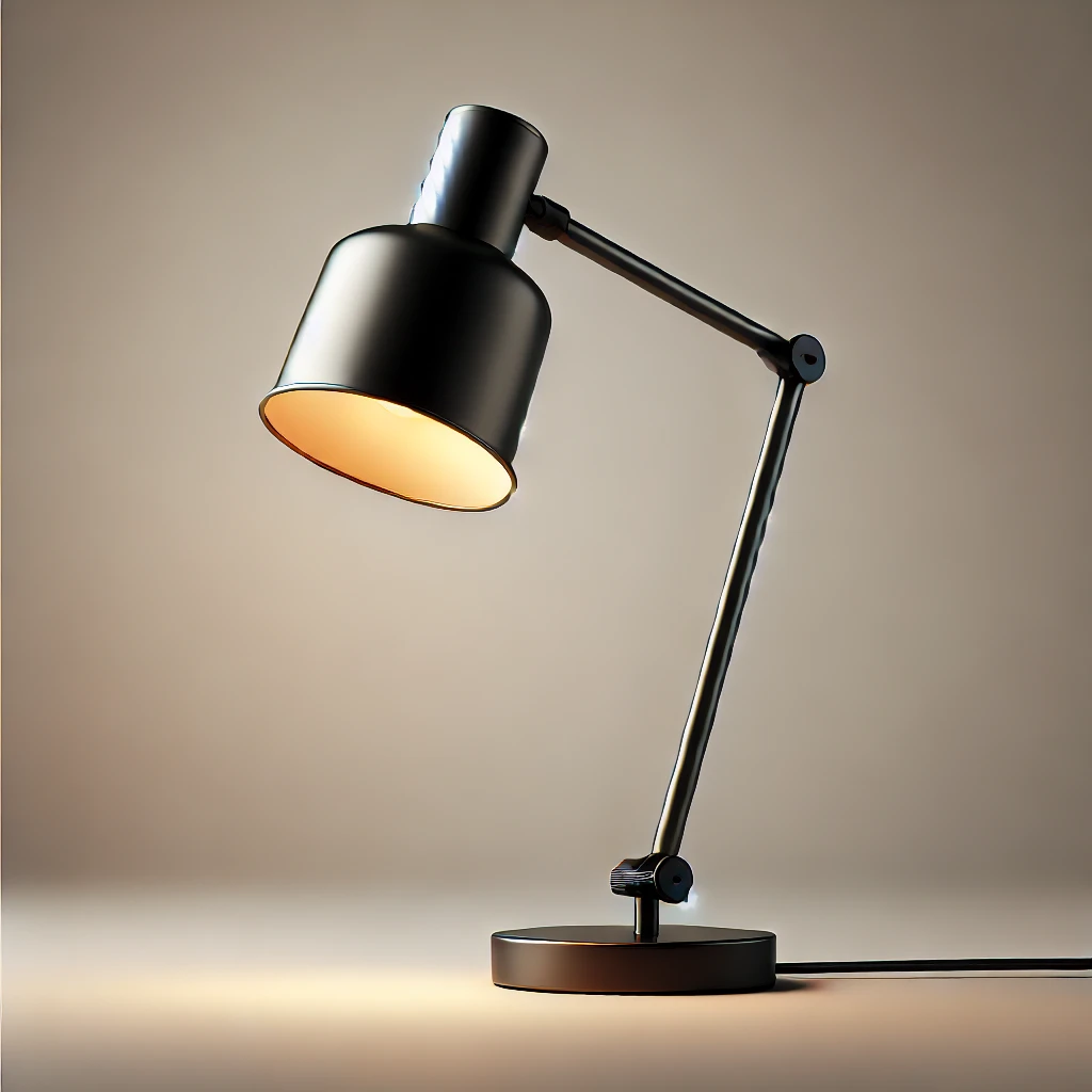 Lámpara de estudio ajustable con brazo metálico negro mate y pantalla cónica, ideal para espacios de trabajo y estudio.